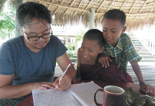 Fr. Kurt learning Burmese with Buddhist novices monks
