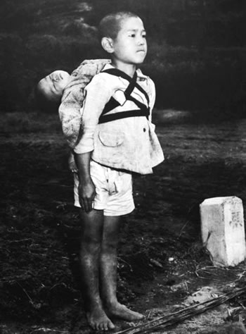 The photo is of a young, bare-footed boy with his dead baby brother strapped to his back. He is waiting for his turn at a make-shift crematorium. This is an open trench, with fire alight, for the bodies of many who died of the radiation poisoning from the atomic bomb which exploded over Nagasaki at 11:02 a.m., August 9, 1945.